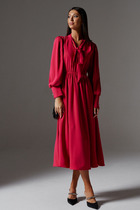 Платье выполнено из премиуального трикотажа, свободного силуэта,с V-образным вырезом горловины,  со спущеным плечом, рукава 7/8. по полочке горизонтальный подрез в котром обработаны карманы. Спинка со средним швом. Горловина обработана бейкой.