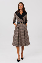 Эффектное и стильное платье, выполнено из мягкого креп-шифона с модным принтом. Платье полностью на трикотажной подкладке. Горловина стойка, которую можно завязать в бант, для придания модели особой нарядности. Платье А-силуэта, по талии на резинке. Спереди и по спинке с рюшей с небольшой сборкой, переходящей в рукав. Рукав полной длины, с манжетой и застежкой на металлическую пуговицу. Модель удобная и практичная, вы будете в нем выглядеть неотразимо и роскошно.