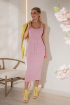 Платье полуприлегающего силуэта, отрезное по линии талии переда, с застёжкой на потайную молнию в среднем шве спинки, с поясом выходящий из рельефных швов завязывающийся по спинке. Перед верху имитации запаха, с рельефными швами и талевыми выточки. Спинка с талевыми выточками и средний шов заканчивающийся шлицей. Рукава реглан, длинные, понизу с притачными манжетами.