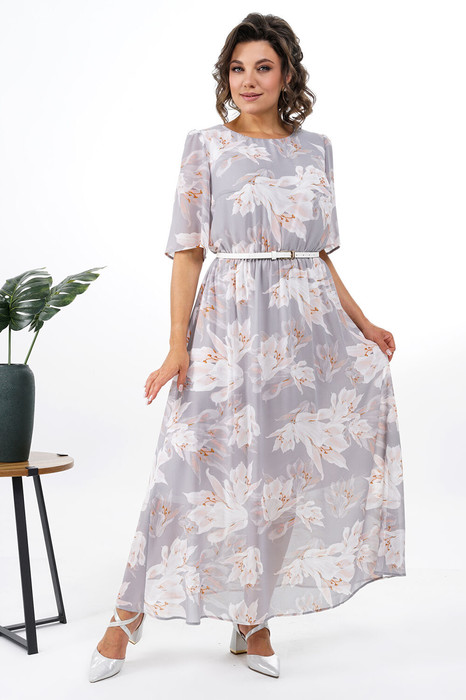 Платье на подкладке, отрезное по линии талии, степень прилегания фиксирует эластичная тесьма. Перед с нагрудными выточками. Спинка со средним швом. Рукава втачные, одношовные, короткие по окату со сборкой. В дополнении ремень.