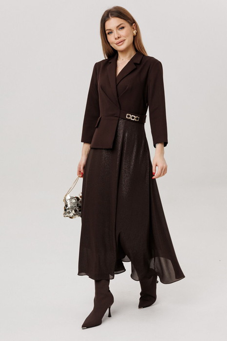 Платье женское прилегающего силуэта, расклешенное к низу. По переду платья нагрудные складки, воротник пиджачного типа, застежка с имитацией запаха,с пришивным декоративным элементом. С переди по талии отдельная фигурная баска с клапаном. Спинка со средним швом и талиевыми вытачками. Рукав одношовный 7/8. Юбка притачная на подкладке. В боковом шве платья застежка на потайную тесьму-молнию.
