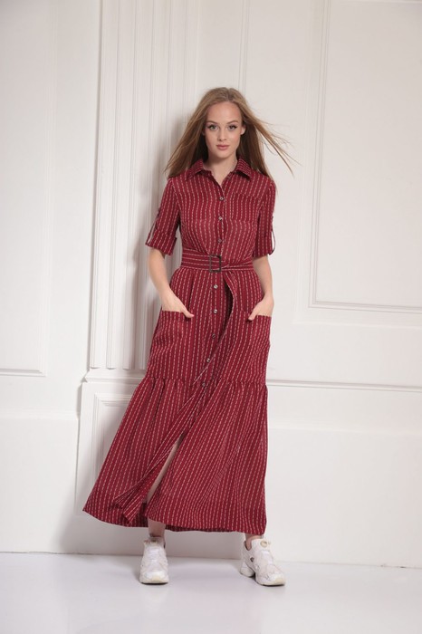 Стильное полосатое платье с накладными карманами и застежкой на пуговицы по переду. Подкладка по юбке платья.