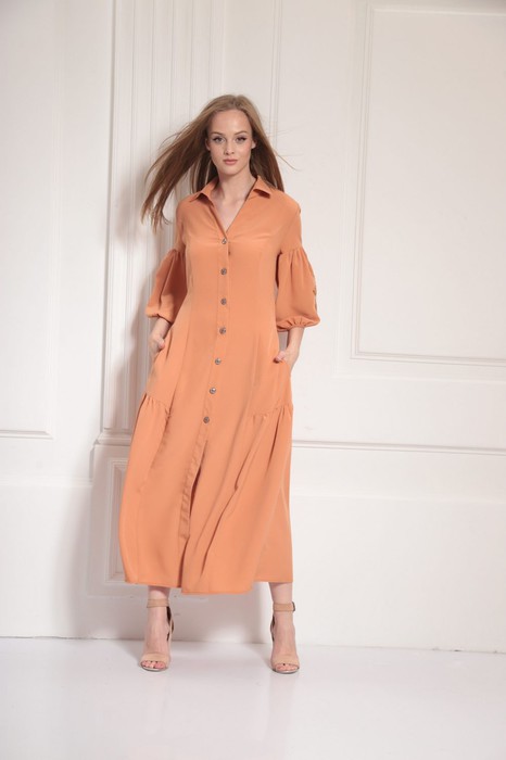 Платье с очень насыщенной дизайнерской вышивкой по объемным рукавам. Застежка по переду на петли и пуговицы. Изделие без подкладки. Карманы в боковых швах.