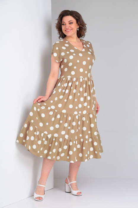 Штапельное бежевое платье в горох. Что может быть приятнее и красивее! По переду горловина с А- образным вырезом ,отрезное по линии талии и тремя воздушными валанами. По спинке по линии талии резинка- венгерка в несколько рядов. Такая отделка по спинке даёт возможность идельно смотреться  на любой фигуре.