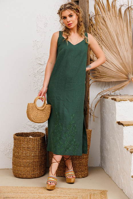 Сарафан из натуральной ткани с дизайнерской вышивкой по низу переда. В боковом шве разрез. По спинке средний шов, молния и талиевые выточки.