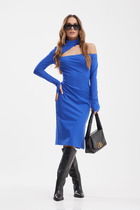 Уютное трикотажное платье создано специально для тех случаев ,когда душа просит женственных нарядов,а погода диктует свои условия. Такое платье будет отлично смотреться на фигуре любого типа. Модель имеет прямой силуэт со спущенной линией плеча, по низу рукава манжета; вырез округлой формы. С  боку изделия разрез.  В комплекте съёмный пояс.