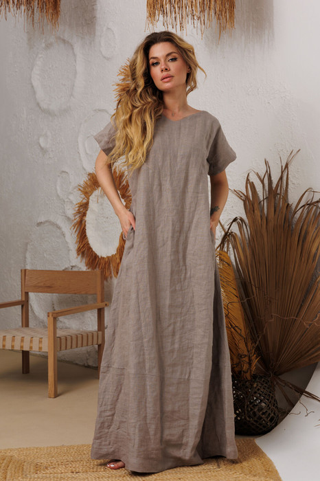 Натуральное льняное  длинное платье прямое, лаконичное спереди и по спике, что очень стройнит. По низу пришита отрезная какетка, которая придает платью неповторимый силуэт. Удобные, вместительные формы карманы в  боковых швах. Горловина деликатным уголком и очень глубокой обтачкой по груди, что позволяет ходить без белья. Все  платья бренда АМУЛЕТ созданы с применением древних славянских законов обережного пошива одежды.