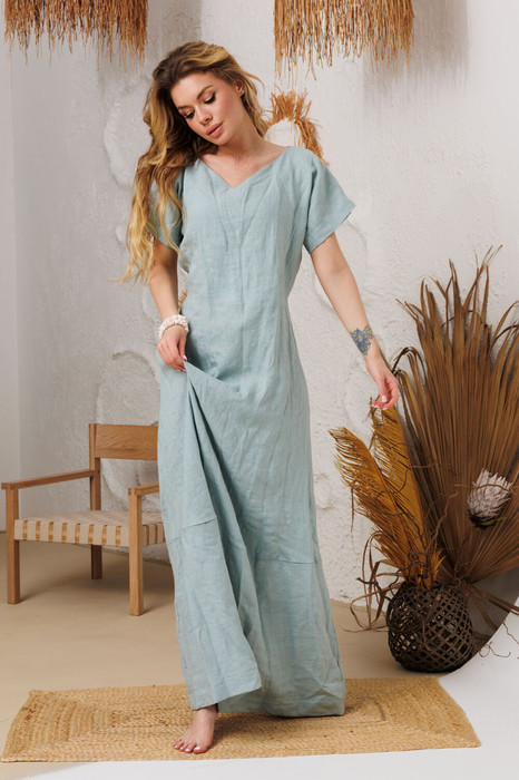 Натуральное льняное  длинное платье прямое, лаконичное спереди и по спике, что очень стройнит. По низу пришита отрезная какетка, которая придает платью неповторимый силуэт. Удобные, вместительные формы карманы в  боковых швах. Горловина деликатным уголком и очень глубокой обтачкой по груди, что позволяет ходить без белья. Все  платья бренда АМУЛЕТ созданы с применением древних славянских законов обережного пошива одежды.
