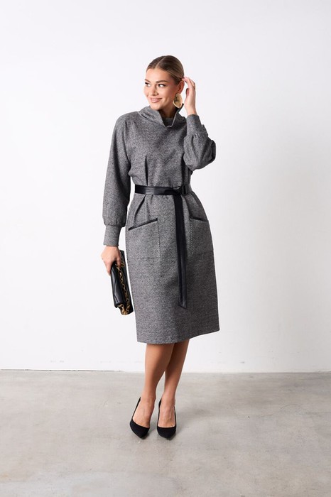 Платье полуприлегающего силуэта из мягкого уютного трикотажа длинной чуть ниже колена. По полочке в области бёдер настрочены накладные карманы с отделкой из кожи. По горловине обработан воротник-хомут. Рукав длинный цельнокроеный, по низу притачная манжета. Платье дополнено съемным поясом из кожи фиксирующимся на пряжку протяжку.