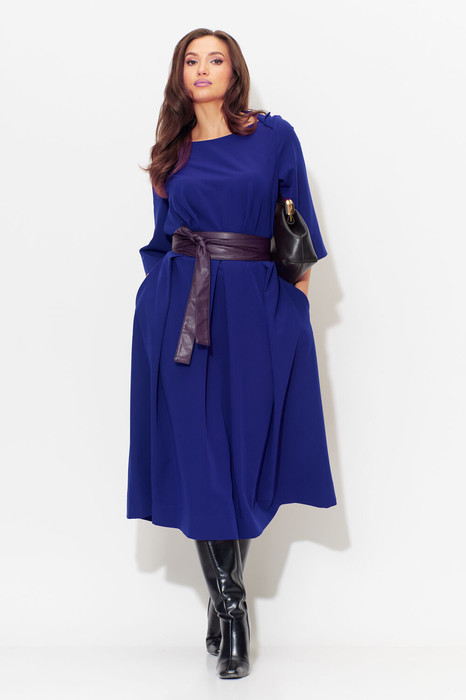 Шикарное женское платье идеально на любую погоду: под босоноржки либо под сапоги и пальто. Отличный вариант универсального изделия: подойдет как для повседневного и офисного гардероба, так и для праздничного выхода. Отрезное по линии талии. По полочке объем груди создается за счет направленных складок из подреза. Объем юбки создается за счет центральной встречной и 2-х односторонних складок. По бокам в юбке- карманы. Рукав втачной, 3/4 длинны с отворотом. Вырез горловины лодочка с отложным воротником. В комплекте съемный пояс. Длина спинки до подреза -45 см., длина юбки -77см. Длина рукава-44 см.