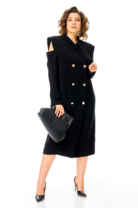 Оригинальное женское платье с крылышками в зоне плеч и груди идеально дополнит женственный образ для любого торжества. Платье из текстильной ткани двубортное, полуприлегающего силуэта. По полочке и спинке прилегание создается за счет рельефов, выходящих из плечевого шва. По спинке - средний шов, переходящий в шлицу. По горловине цельнокроеная стойка. Застежка на петли и пуговицы. Рукав втачной одношовный с открытым плечом. Длина по спинке: (48-54)-119 см. Длина рукава: (48-54)-52см