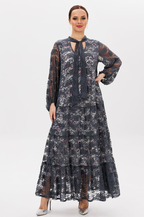 Вечернее платье макси   из кружевного полотна, на подкладке, трапециевидного силуэта — дополнение любого образа. Отличный вариан на любое торжество.   По горловине V-образный вырез и стойка переходящая в бант. Рукав расширенный к низу, на резинке, фигурный. По полочке и спинке идут 3 присобранных волана.  Длина платья (по спинке):(50-54) 135см. Длина рукава: (50-60)-56см.