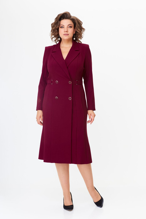 Платье полуприлегающего силуэта, выполнено из однотонной ткани. Платье длиной за колено, с небольшим расклешением по низу. Полочка платья с двубортной застежкой на пуговицы. Полочка с вертикальными рельефами. В шве притачивания бочка к средней части полочки обработан карман. Горловина V-образной формы, с отложными лацканами и воротником пиджачного типа. В области талии выполнен декоративный элемент из хлястиков и металлических рамок.