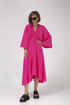Платье полуприлегающего силуэта, длиной за колено, выполнено из однотонной ткани. Передняя часть платья состоит из верхней и нижней части платья. Нижняя часть лифа полочки с вертикальными рельефами. Верхняя левая часть со складками, правая часть в виде детали-хвоста, закрепленного в плечевой срез и пройму. Низ хвоста с декором из тесьмы. Горловина V-образной формы. Нижняя часть переда с талиевыми вытачками. Спинка со средним швом и вертикальными рельефами. В верхней части среднего шва спинки обработана потайная молния, в нижней части разрез. По боковым швам в области талии настрочены шлевки, через которые продет пояс с пряжкой. Рукав длиной до локтя, втачной, одношовный. По окату рукава обработаны складки. Платье на плечиках.
