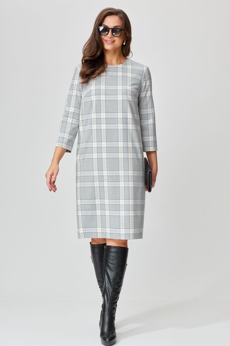 Платье женское прямого силуэта, выполнено из костюмной поливискозы. Перед с нагрудными вытачками, с карманами в швах, спинка со швом посередине. Горловина округлой формы, рукава втачные одношовные, длиной 3/4. Изделие на подкладке.