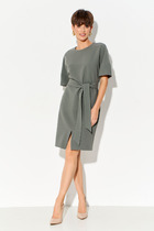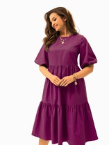 Платье женское, прямого силуэта, чуть расширенное к низу, длина за колено. Рукав втачной, длина 3/4, низ на резинке. По переду нагрудные вытачки и застежка на петли пуговицы до талии. Горловина обработана отложным воротником с рюшей. Дополнительно талию можно подчеркнуть при помощи съемного пояса. Стильное, женственное и многофункциональное платье станет отличным дополнением вашего образа.