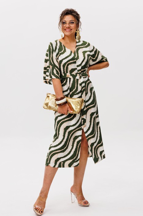 Это платье в цвете «зеленые волны» — образец сдержанной элегантности и безупречного вкуса. Его прямой силуэт мягко следует линиям фигуры, создавая лаконичный и при этом выразительный силуэт. Рукав в стиле кимоно добавляет образу легкость и динамику, делая каждое движение плавным и изящным.