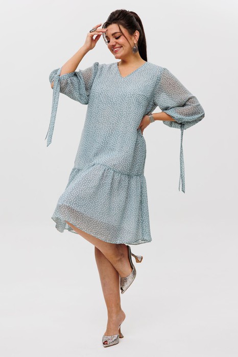 V-образный вырез горловины добавляет элегантности, а волан по низу платья придаёт романтичную нотку образу. Рукава украшены завязками, что делает образ ещё более утончённым.