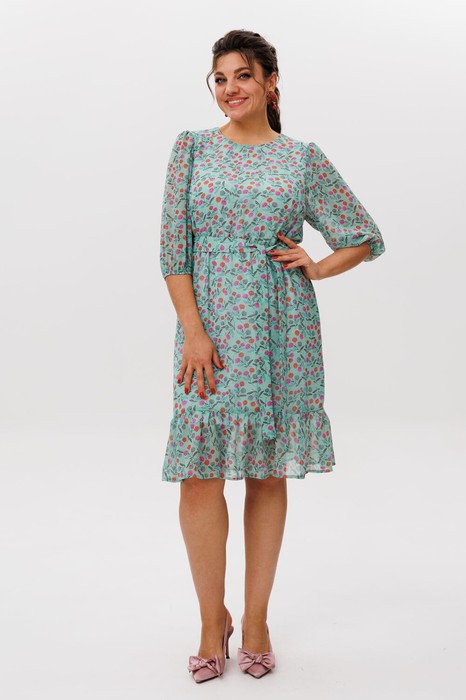 Это платье «мятная феерия» — воплощение элегантности и романтики. Сшитое из лёгкого шифона с нежным цветочным принтом, оно создаёт воздушный и женственный образ. Прямой крой с изящным воланом по подолу придаёт силуэту мягкую динамику, а резинка по талии подчёркивает фигуру, сохраняя удобство.