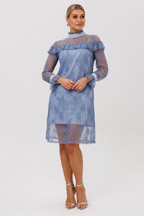 Это платье, сотканное из воздуха и тончайших нитей. Нежное кружевное полотно, подобно легкой дымке, обволакивает силуэт, заключая его в элегантные и строгие линии прямого кроя. Изысканность кроется в деталях: кокетки, украшающие лиф спереди и сзади, мягко ниспадают изящными волнами, подчеркивая линию плеч и даря образу трогательную, почти что хрупкую грацию.