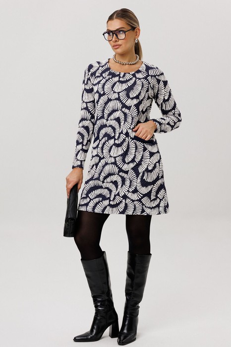 Плотный трикотаж в сочетании с приталенным силуэтом мягко подчеркивает достоинства фигуры. Круглый вырез элегантно обрамляет линию шеи и ключиц, а слегка расклешенная юбка создает лаконичный и женственный образ.