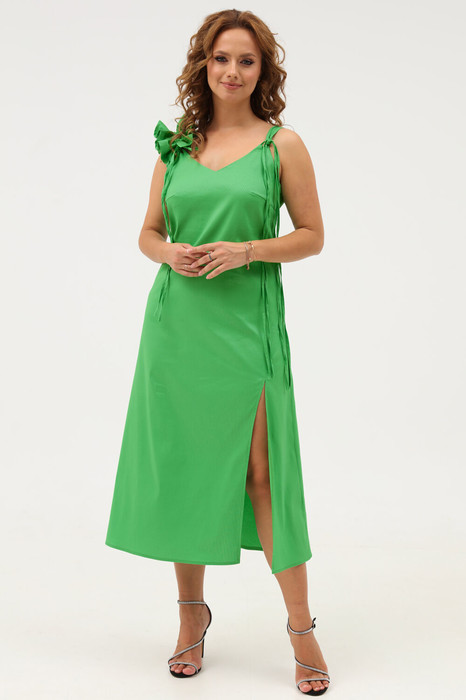 Платье полуприлегающее А-силуэта с тонкими бретелями на завязках. Горловина по переду V-образной формы. По переду нагрудные вытачки и разрез, а спинка - с рельефами. Застежка на потайную молнию в боковом шве. В комплекте съемные рюши на бретели из основной ткани.