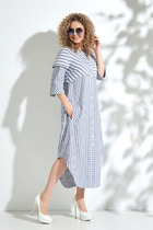Платье из двух видов ткани полуприлегающего силуэта, расклешенное книзу. Воротник отложной плосколежащий, декорирован бусинами. Платье отрезное по линии талии. По переду обработаны нагрудные вытачки. Спинка с застежкой молнией в среднем шве. Рукав втачной длинной 3/4, на резинке понизу, с горизонтальным подрезом и с защипами. В боковых швах расположены карманы.  Особый шарм платью придаст пояс из основной ткани, декорированный бантом.