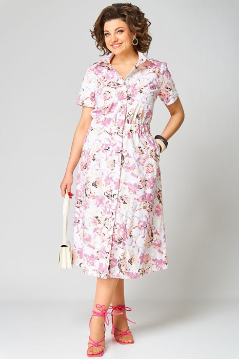 Платье полуприлегающего силуэта, расклешенное книзу. Воротник отложной, на притачной стойке. Платье отрезное по линии талии, на широкой резинке. Платье с центральной застежкой на петли и пуговицы на притачных планках. Полочка с нагрудными вытачками. В боковых швах юбки функциональные карманы. Рукав втачной короткий с широкой декоративной патой, понизу — притачная манжета.