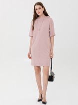 Платье полуприлегающего силуэта, расклешенное книзу. Воротник отложной, на притачной стойке. Платье отрезное по линии талии, на широкой резинке. Платье с центральной застежкой на кнопки на притачных планках. Полочка с нагрудными вытачками. В боковых швах юбки функциональные карманы. Рукав втачной короткий, с открытым плечом, понизу — притачная манжета и декоративная пата на пуговице.