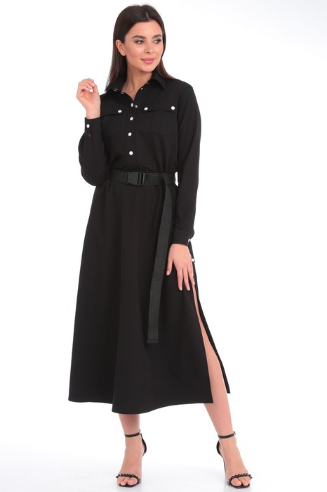 Лаконичное женское платье выручит свою обладательницу в любой ситуации. Благодаря своей универсальности платье отлично подойдет для любого мероприятия или повода: на деловой или дружеской встрече, в офисе или кафе. Платье полуприлегающего силуэта, расклешенное книзу. Воротник рубашечного типа на притачной стойке. Платье отрезное по линии талии, со шлевками для пояса. Полочка с центральной застежкой на притачных планках на контрастные кнопки, нагрудными вытачками и накладными карманами со складкой и клапаном. В боковых швах юбки планки с застежкой на контрастные кнопки и разрезы. Рукав втачной длинный, понизу с притачной манжетой с застежкой на кнопку. В комплект входит пояс из стропы.