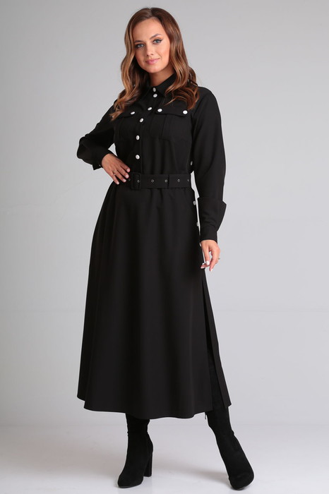 Лаконичное женское платье выручит свою обладательницу в любой ситуации. Благодаря своей универсальности платье отлично подойдет для любого мероприятия или повода: на деловой или дружеской встрече, в офисе или кафе. Платье полуприлегающего силуэта, расклешенное книзу. Воротник рубашечного типа на притачной стойке. Платье отрезное по линии талии, со шлевками для пояса. Полочка с центральной застежкой на притачных планках на контрастные кнопки, нагрудными вытачками и накладными карманами со складкой и клапаном. В боковых швах юбки планки с застежкой на контрастные кнопки и разрезы. Рукав втачной длинный, понизу с притачной манжетой с застежкой на кнопку. В комплект входит пояс из основной ткани.