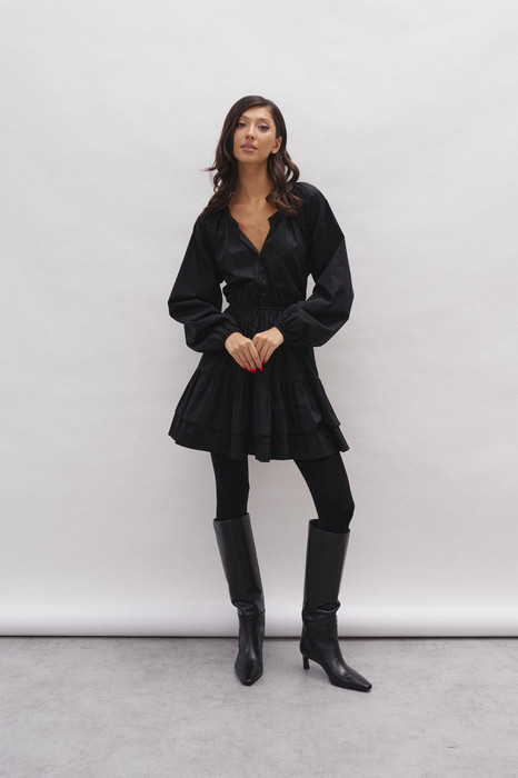 Платье полуприлегающего силуэта выполнено из полотна черного цвета. Характеристики: полуприлегающий силуэт, отрезное, отрез на резинке, горловина овальная, застежка центральная на петли пуговички, рукав - покрой реглан, по низу рукава резинка, юбка в изделии на подкладке по низу волан. Длина изделия по спинке 86, длина от края горловины 58 см.