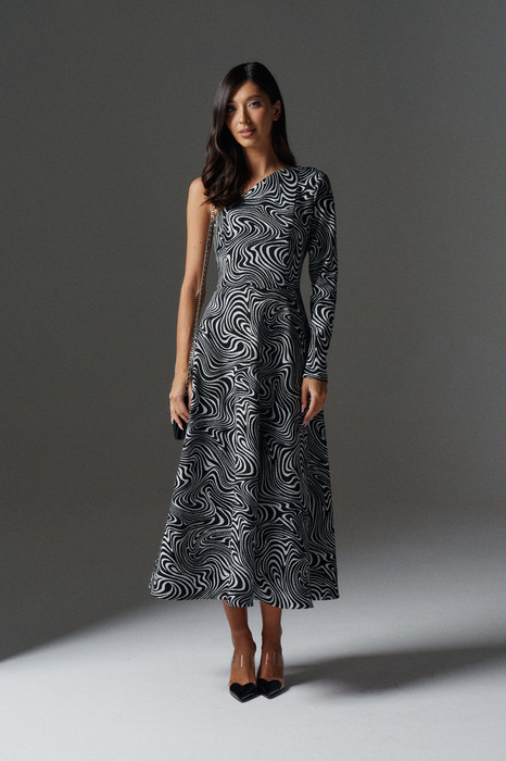 Платье с открытым плечом полуприлегающего силуэта выполнено из трикотажного полотна с анималистическим абстрактным принтом. Характеристики: полуприлегающий силуэт, отрезное, открытое плечо, застежка потайная тесьма молния в среднем шве заднего полотна изделия. Длина от верхнего края плеча 127 см, длина рукава 67 см.