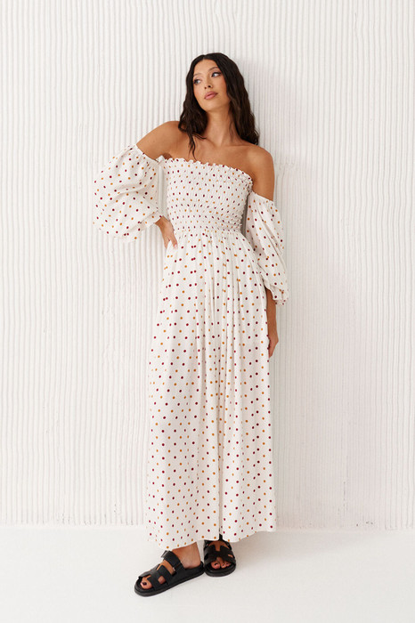 Платье с открытыми плечами выполнено из белого полотна с принтом горох. Характеристики: полуприлегающий силуэт, открытые плечи, отрезное, верх изделия выполнен венгеркой, во верхней части рукава резинка, низ в изделии на подкладке свободного кроя. Длина по спинке 125 см