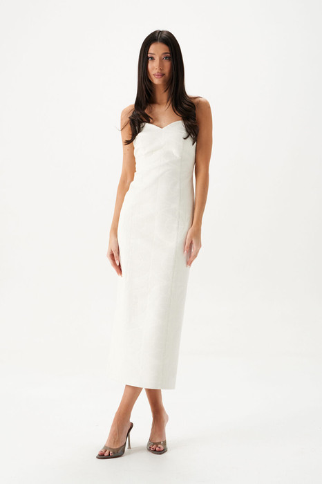 Платье-миди. Выполнено из эко-кожи в белом цвете с вышивкой. Прилегающий силуэт. Верх фигурный, имитация корсета. В среднем шве заднего полотна застёжка - потайная тесьма-молния. Есть подкладка. По задней части шлица 53 см. Длина спинки 108 см