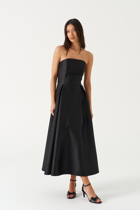 Платье полуприталенное, выполнено из ткани черного цвета с блеском. Характеристики: А-образный силуэт, лиф корсетный, прямой вырез, отрезная, брендированная подкладка, в ценральном шве на спинке потойная молния, по переду и спинке лифа вытачки. Длина изделия по центру спинки 107 см, длина по боковому шву 113см.