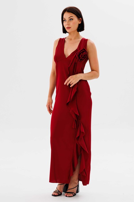 Платье в длине миди, выполнено из шелка армани, лиф отрезной, по переду сбоку обработан вырез с воланом. Застежка - потаная молния в боковом шве. Декор в виде цветка с воланами отстегивается.