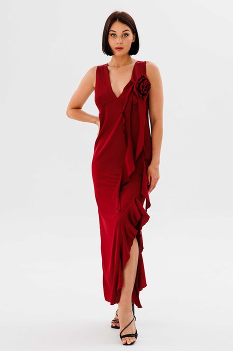 Платье в длине миди, выполнено из шелка армани, лиф отрезной, по переду сбоку обработан вырез с воланом. Застежка - потаная молния в боковом шве. Декор в виде цветка с воланами отстегивается.