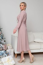 Платье в длине миди, выполнено из шелка армани, лиф отрезной, по переду сбоку обработан вырез с воланом. Застежка - потаная молния в боковом шве. Декор в виде цветка с воланами отстегивается.