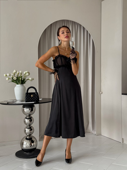Ультра женственное платье из лёгкой атласной ткани. Подчеркнутая линия груди в виде чашечек с изящными шифоновыми вставками. Тонкие атласные лямки. Застежка на потайную молнию. Платье подчеркивает силуэт. Длина миди. Идеальный вариант для свидания и особых случаев.