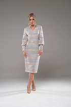 Платье женское из однотонной плательной ткани с эластаном. Прилегающего силуэта, с втачным рукавом, отрезное по линии талии с баской по переду изделии, с накладными карманами и планкой с пуговицами по верхней части переда, нижняя часть изделия-юбка заужена книзу, со шлицей по спинке, без подкладки.