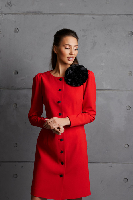 Платье женское из однотонной ткани, прилегающего силуэта, вырез горловины полукруглый, рукав втачной со сборкой по верхней части, застежа спереди на пуговицы, по переду и спинке изделия вытачки, спереди отделочная деталь-декоративный цветок из ткани, съемный, платье на подкладке.