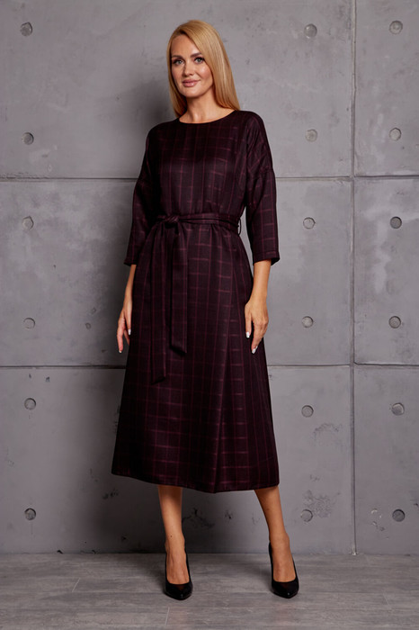 Платье женское из плательной ткани, полуприлегающего силуэта, под пояс из той же ткани, вырез горловины полукруглый, рукав 3/4 длины на спущенной пройме, карманы в боковых швах, по переднему полотнищу юбки-складки, застежка по среднему шву спинки на молнию, изделие без подкладки.