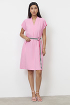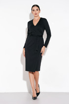Женское платье полуприлегающего силуэта выполнено из однотонной плательно-костюмной ткани. Перед с подрезам ниже линии талии.Верхняя часть переда со средним швом и нагрудными вытачками из горловины.Нижняя часть переда с вертикальными карманами с листочками и клапанами с декоративными пуговицами. Спинка со средним швом и вытачками из горловины. Рукава втачные двухшовные длиной 3/4. Горловина с цельнокроеной стойкой и каплей по переду. Низ платья фигурный с разрезами по бокам.