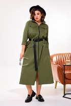 Платье женское из трикотажного полотна «кулирка» с набивным рисунком в комбинации двух видов полотен в единой цветовой гамме, свободного покроя, удлиненное, с короткими втачными рукавами и горловиной овальной формы. Детали переда и спинки с центральным швом, правые и левые детали полочки и спинки отрезные по линии талии и бедер, нижние детали присборены по швам соединения с верхними. На левой полочке выполнена вышивка.