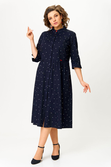 Платье женское, повседневное, полуприлегающего силуэта, отрезное по линии талии, длиной ниже линии колен, из хлопковой ткани. Перед с застежкой на пуговицы.  Вырез горловины обработан воротником на стойке. Рукав втачной, по низу обработан цельнокроенной манжетой. Длина по спинке 117 см, длина рукава 16,5 см.