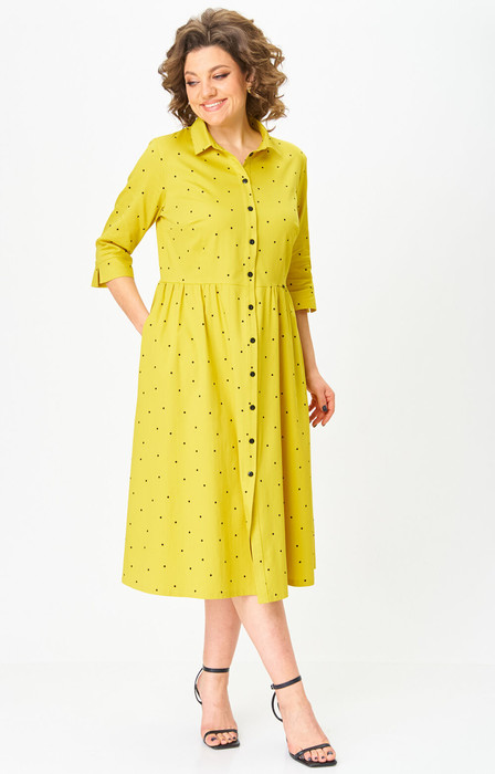 Платье женское, повседневное, полуприлегающего силуэта, отрезное по линии талии, длиной ниже линии колен, из хлопковой ткани. Перед с застежкой на пуговицы.  Вырез горловины обработан воротником на стойке. Рукав втачной, по низу обработан цельнокроенной манжетой. Длина по спинке 117 см, длина рукава 16,5 см.