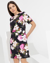 Платье женское полуприлегающего силуэта двухслойное. Прилегание достигается за счет нагрудных вытачек и талиевых по спинке. Застежка молния по спинке. Верхняя часть платья из шифона с притачной контрастной планкой по всей длине. Спереди короче, по спинке длиннее. Платье украшено съемной брошью. Длина изделия- 105 см, накидки спереди- 57 см, по спинке- 74 см.