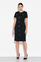 Платье женское А-силуэта. Перед с центральным швом и отделочной строчкой, по низу с приточным валаном. Рукав втачной свободного кроя. Перед и валан украшены пуговицами.