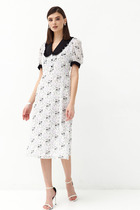 Эльфина – лёгкое платье А-образного силуэта из льняной ткани. Вырез горловины классический круглый с V-образным вырезом по переду. На груди - вытачки, плавно переходящие в линию кармана. По низу платья волан из шифона, придающий образу легкость. Рукава 3/4, втачные, из шифона. По спинке потайная "молния". Данная модель отличается особой легкостью и непринужденностью, яркий цветочный принт не оставит вас незамеченной!